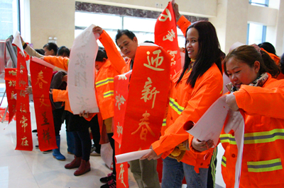“春滿人間百花吐艷 福臨小院四季常安” “一帆風順年年好 萬事如意步步高” ……1月26日至28日,麗匯大廈一樓熱鬧非凡,為了感激社會各界對綠港集團的關(guān)心與支持,由綠港集團工會組織的書法家“迎新春 送祝福”義務(wù)送春聯(lián)活動吸引了大量前來求墨寶的社會各界人士。三位南寧市書法協(xié)會的書法家以及南寧科巨公司副總經(jīng)理陸章發(fā)為觀眾們現(xiàn)場揮毫,一幅幅金燙燙、散發(fā)著墨香的春聯(lián)映襯著人們的笑臉,整個現(xiàn)場彌漫著濃濃的年味,短短三天時間便送出了2000多副春聯(lián)。1月26日上午,綠港集團工會還啟動了派送春聯(lián)儀式,綠港集團工會主席黃麗琴帶領(lǐng)工會人員將春聯(lián)送到經(jīng)開區(qū)40余位保潔人員、園林綠化工人、公司職工的手上。(張彩秀/文、圖)