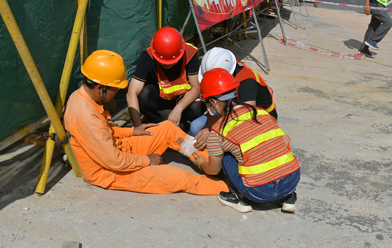 現(xiàn)場(chǎng)模擬一名工人在2#、3#廠房間的廊架上進(jìn)行施工作業(yè)時(shí),因未系安全帶、腳下未踩穩(wěn)造成高處墜落受傷,其他人員對(duì)其進(jìn)行急救的情況。從發(fā)現(xiàn)人員墜落受傷、疏散人群、封鎖現(xiàn)場(chǎng)到對(duì)受傷人員骨折部位用夾板進(jìn)行固定再送至醫(yī)院,僅歷時(shí)10分鐘。整個(gè)過程緊張有序,應(yīng)急處理得當(dāng)。演練中,現(xiàn)場(chǎng)每名救援人員嚴(yán)肅認(rèn)真對(duì)待每個(gè)演練細(xì)節(jié)。各應(yīng)急小組聞聲而動(dòng),各司其職,反應(yīng)迅速,各環(huán)節(jié)無縫銜接,使救援任務(wù)得以順利完成。