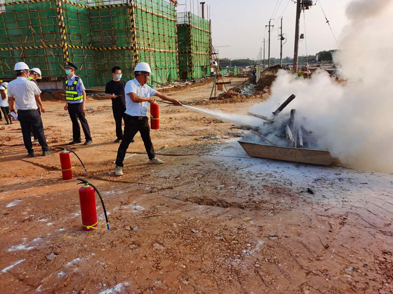 此次活動(dòng)主要是模擬火災(zāi)發(fā)生后的應(yīng)急處置。活動(dòng)當(dāng)天,發(fā)現(xiàn)險(xiǎn)情后,安全員立即上報(bào),并進(jìn)行控制和處理,并播報(bào)消防疏散通知。在總指揮的安排下,安全防護(hù)組、滅火行動(dòng)組、疏散救援組、通訊聯(lián)絡(luò)組同時(shí)行動(dòng)。安全防護(hù)組立刻關(guān)閉總電源閘門;滅火行動(dòng)組拿取就近的消防器材進(jìn)行滅火;疏散救援組迅速引領(lǐng)工人從安全通道撤離到安全地點(diǎn);通信聯(lián)絡(luò)組將現(xiàn)場(chǎng)情況及時(shí)反饋給總指揮和現(xiàn)場(chǎng)指揮。待火勢(shì)完全撲滅,所有人員到達(dá)預(yù)定安全地點(diǎn),通訊聯(lián)絡(luò)組認(rèn)真清點(diǎn)人數(shù),確認(rèn)無任何人員傷亡及財(cái)產(chǎn)損失。演練結(jié)束后,項(xiàng)目部組織滅火器的實(shí)操練習(xí)。施工人員按照講解的動(dòng)作要領(lǐng)使用了滅火器,對(duì)布置的“起火點(diǎn)”進(jìn)行有效撲救。